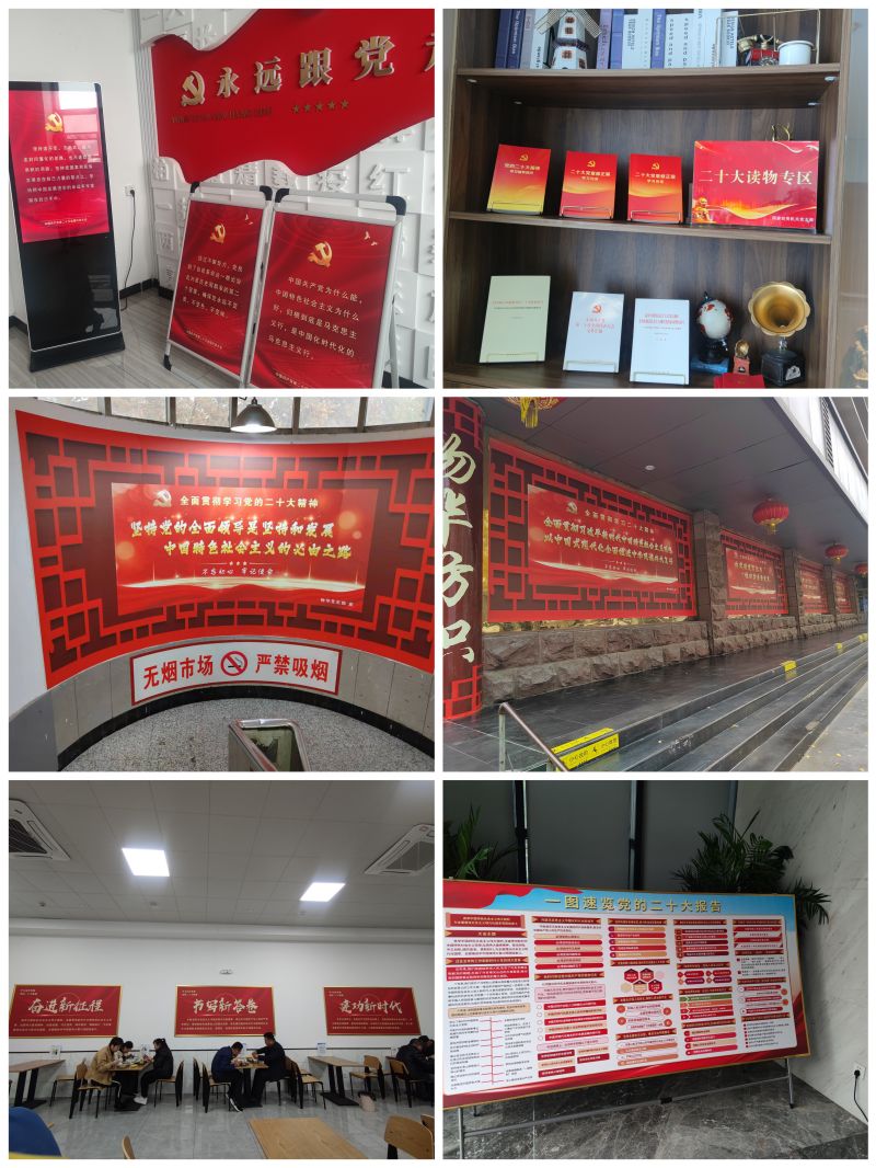 為深入學(xué)習(xí)宣傳貫徹黨的二十大精神,公司各所屬黨支部全方位營造濃厚學(xué)習(xí)氛圍:在電梯口、文化走廊、職工食堂等場所懸掛二十大精神金句宣傳展板及橫幅;在休息區(qū)增設(shè)二十大圖書角,放置二十大精神學(xué)習(xí)圖書及相關(guān)輔導(dǎo)讀本;利用電子屏幕滾動播放二十大精神金句圖片,在職工食堂用電視播放中國共產(chǎn)黨國際形象網(wǎng)宣片、二十大微視頻等,讓大家“抬頭看得見、隨處可以學(xué)、時時能感受”,積極營造出了全面貫徹學(xué)習(xí)黨的二十大精神的濃厚學(xué)習(xí)氛圍,引導(dǎo)全體黨員干部職工在學(xué)習(xí)中明方向,在感悟中找坐標(biāo),全方位、多角度地宣貫二十大精神影響力。