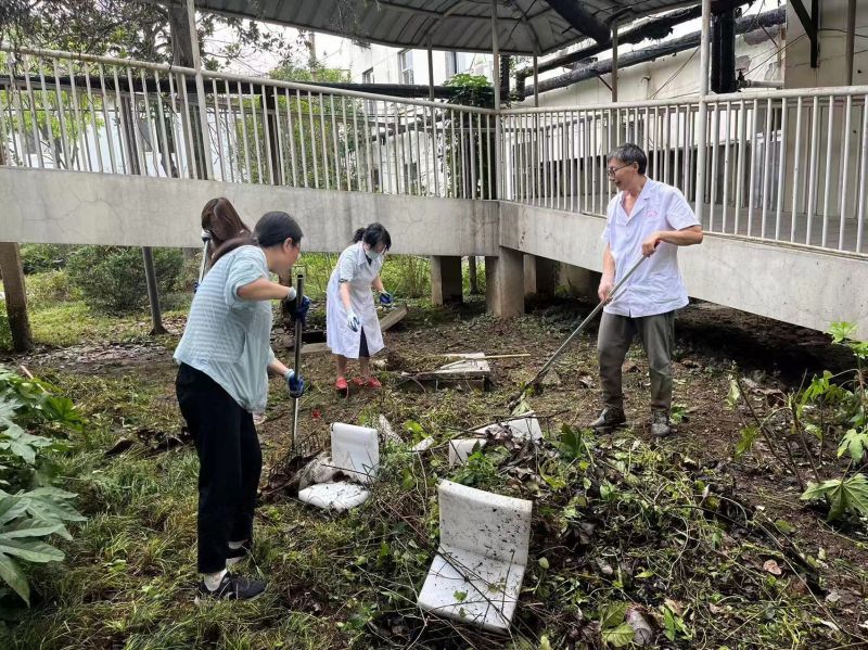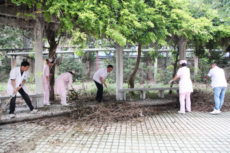 清潔活動實行包干到組。院內各個綠化區(qū)分成26個區(qū)域,由全院各科室分為26個小組負責,每個小組設包干院領導和責任人。由于剛剛完成修剪工作,綠化區(qū)表面布滿了厚厚的樹枝及樹葉,加之連下幾天大雨,地面潮濕,腐爛的樹葉發(fā)出刺鼻的霉味,給清潔任務帶來了不便。