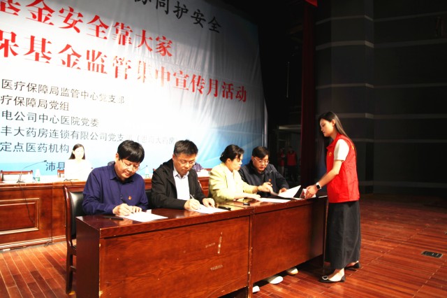 啟動儀式上,全體參會人員集體觀看了《醫(yī)保基金監(jiān)管警示教育片》,通過典型案例剖析,筑牢監(jiān)管防線。隨后,沛縣常務(wù)副縣長趙蓉發(fā)表致辭;縣醫(yī)療保障局傳達(dá)了國家及省市關(guān)于2025年打擊欺詐騙保專項(xiàng)工作文件精神,部署醫(yī)保基金監(jiān)管集中宣傳月重點(diǎn)任務(wù),并與醫(yī)藥機(jī)構(gòu)代表大屯煤電中心醫(yī)院、恩齊大藥房簽署《黨建共建協(xié)議》,構(gòu)建“黨建+業(yè)務(wù)”協(xié)同監(jiān)管機(jī)制;大屯煤電中心醫(yī)院黨委書記張心海與江蘇益豐大藥房連鎖有限公司恩奇大藥房總經(jīng)理丁力分別宣讀《定點(diǎn)醫(yī)療機(jī)構(gòu)誠信服務(wù)承諾書》《定點(diǎn)零售藥店誠信服務(wù)承諾書》;市醫(yī)保局監(jiān)管中心李巋處長解讀《醫(yī)療保障基金使用監(jiān)督管理?xiàng)l例》及2025年打擊欺詐騙保新政策,重點(diǎn)闡釋“藥品追溯碼全流程采集”等創(chuàng)新制度。