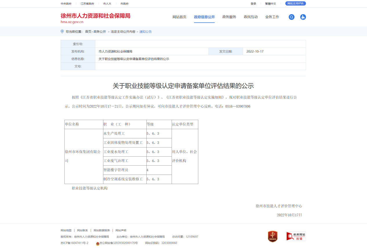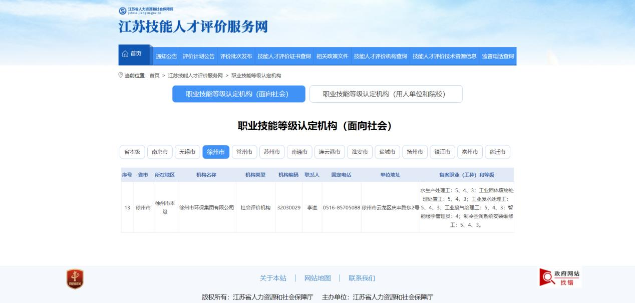 近日,江蘇技能人才評價服務網公布了職業(yè)技能等級認定機構(面向社會)名單,徐州市環(huán)保集團評價中心作為徐州市本級職業(yè)技能等級認定機構位列其中,公示備案職業(yè)(工種)和等級為水生產處理工:5、4、3;工業(yè)固體廢物處理處置工:5、4、3;工業(yè)廢水處理工:5、4、3;工業(yè)廢氣治理工:5、4、3;智能樓宇管理員:4;制冷空調系統(tǒng)安裝維修工:5、4、3。