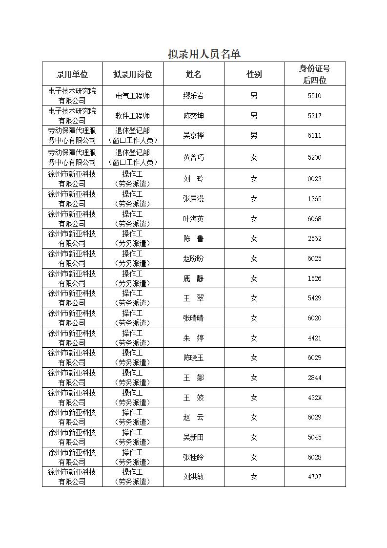 根據(jù)《徐州市國有資產(chǎn)投資經(jīng)營集團(tuán)有限公司招聘工作人員公告》相關(guān)要求,海鷗集團(tuán)所屬電子技術(shù)研究院有限公司、勞動(dòng)保障代理服務(wù)中心有限公司、徐州市新亞科技有限公司公開招聘工作已經(jīng)完成,現(xiàn)將擬錄用人員名單進(jìn)行公示。公示期自2023年5月6日起至5月11日止。如對公示對象錄用資格有異議,請于公示期內(nèi)向海鷗集團(tuán)組織人事部(紀(jì)檢監(jiān)察室)反映。