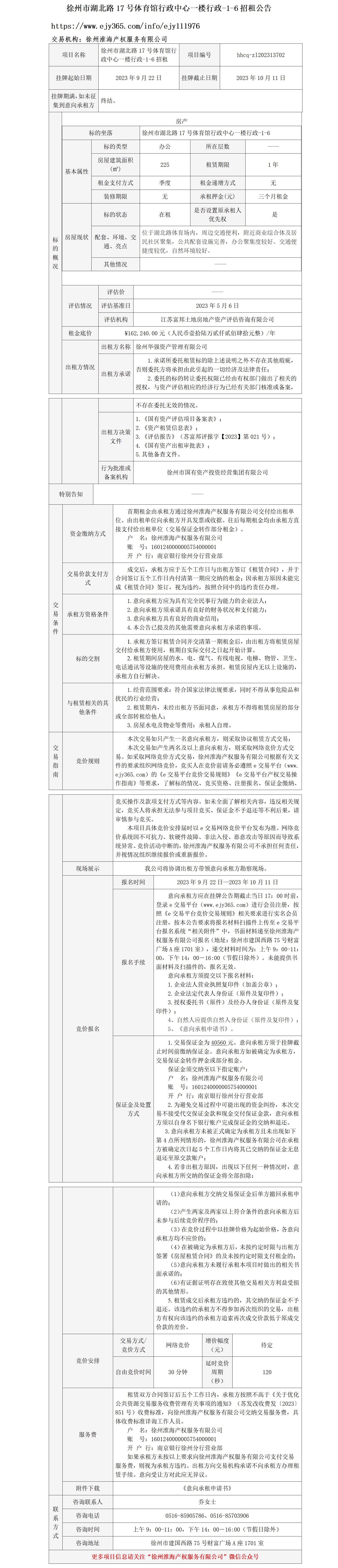徐州市湖北路17號體育館行政中心一樓行政-1-6招租公告