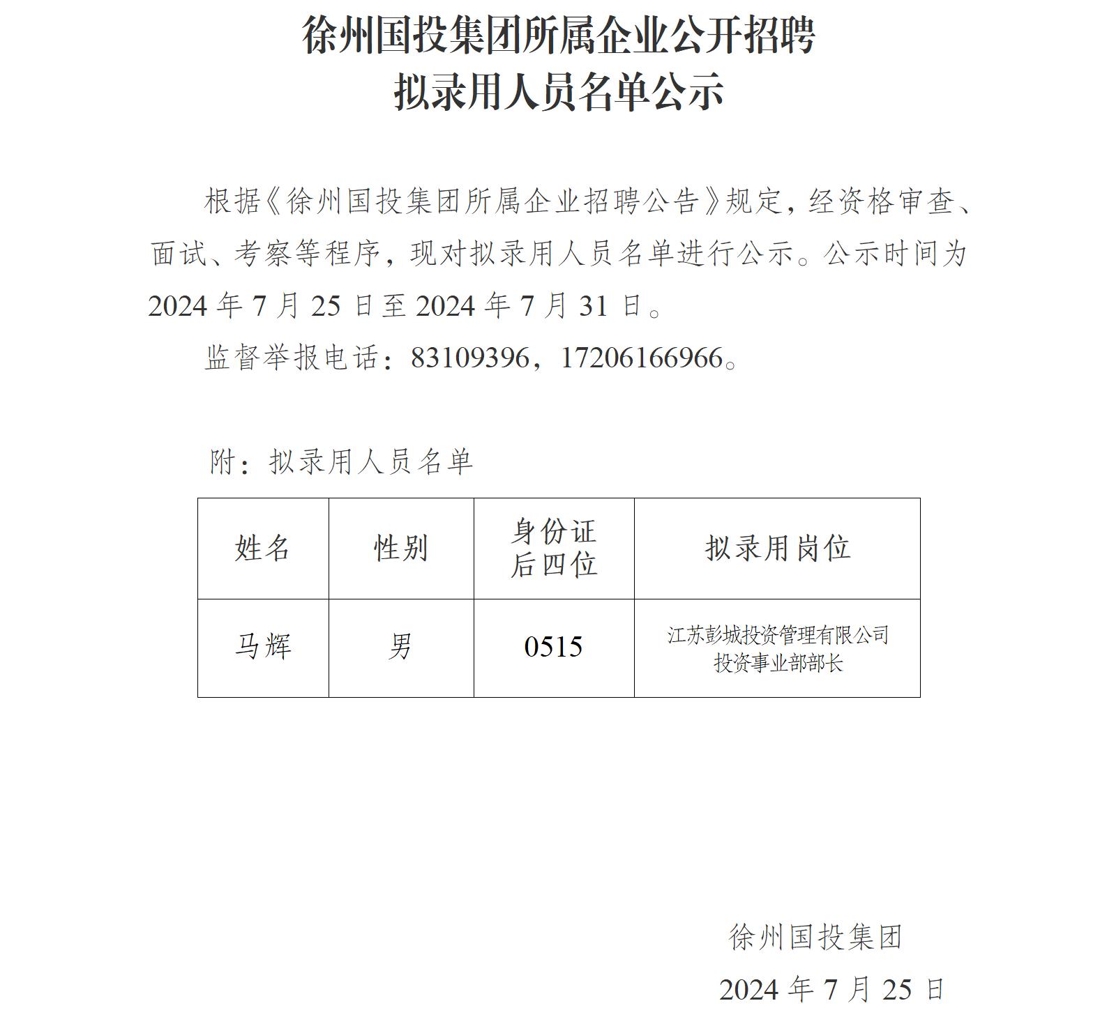 徐州國投集團(tuán)所屬企業(yè)公開招聘擬錄用人員名單公示