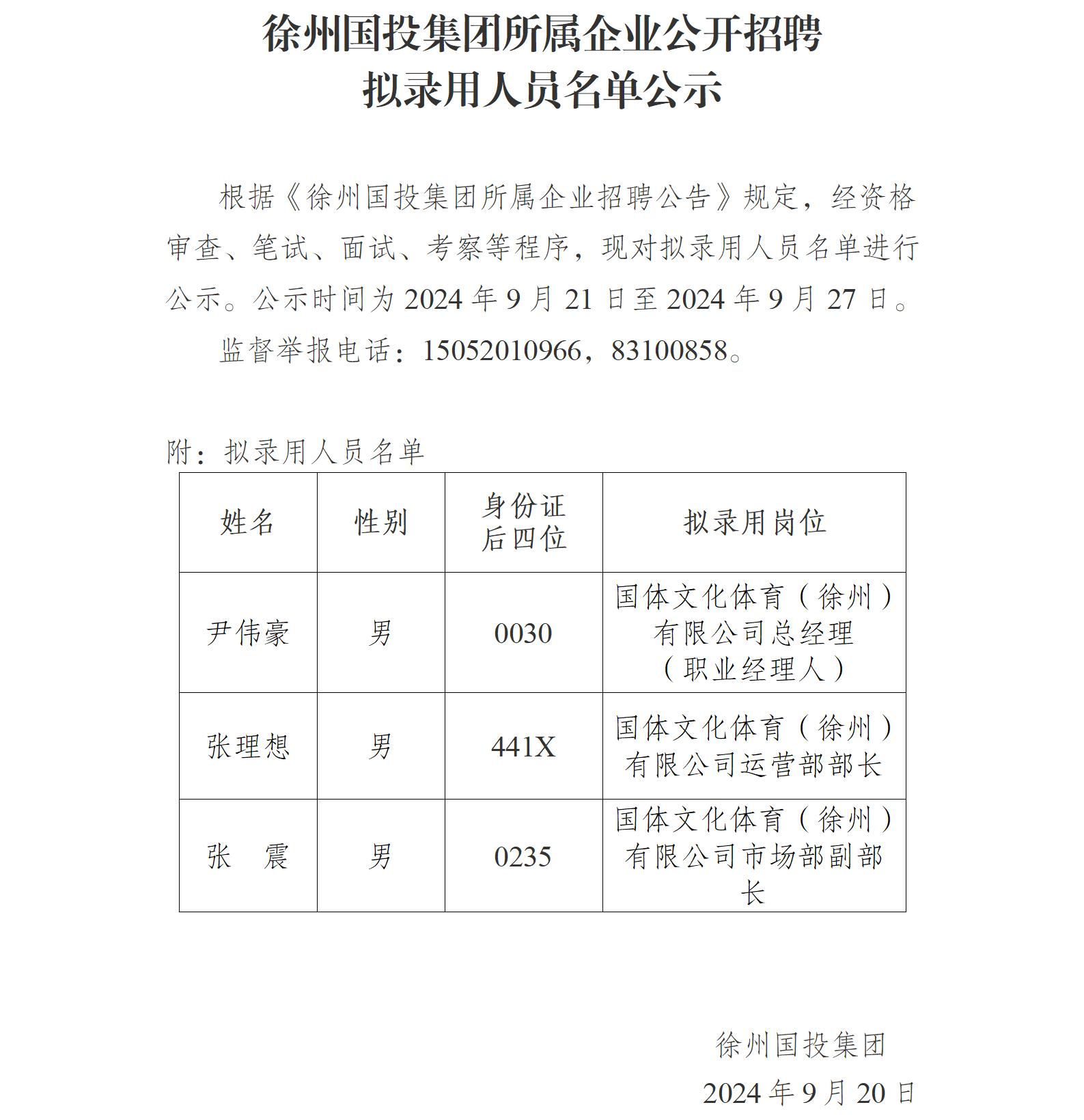 徐州國投集團(tuán)所屬企業(yè)公開招聘擬錄用人員名單公示