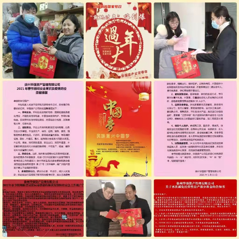 冬夏交替,歲月流轉(zhuǎn)。即將過去的2020年是眾志成城、全民抗疫的非常之年,也是華強資產(chǎn)公司與全體承租戶共克時艱、共同成長的一年,公司的踏浪前行離不開租戶給予的信任、幫助和寬容。乘著辭舊迎新的東風,在新春佳節(jié)來臨之際,為積極響應國家衛(wèi)健委和徐州市政府“就地過年”行…