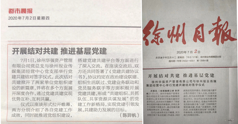 為深入貫徹黨的十九大精神,扎實(shí)推進(jìn)習(xí)近平新時(shí)代中國(guó)特色社會(huì)主義思想學(xué)懂弄通做實(shí),著力發(fā)揮黨建引領(lǐng)鑄魂聚力功能,不斷提升基層黨組織組織力、引領(lǐng)力、凝聚力。7月1日上午,適逢中國(guó)共產(chǎn)黨成立99周年華誕之際,徐州華強(qiáng)資產(chǎn)管理有限公司黨總支同徐州報(bào)業(yè)傳媒集團(tuán)經(jīng)營(yíng)中心黨支部開展黨建結(jié)對(duì)共建活動(dòng),以一支一項(xiàng)“報(bào)業(yè)企業(yè)手拉手,助力兩新企業(yè)發(fā)展”為主題,形成“共建組織、共抓隊(duì)伍、共享資源,共謀發(fā)展”的基層黨建工作新格局,進(jìn)一步加強(qiáng)基層黨組織隊(duì)伍建設(shè),實(shí)現(xiàn)優(yōu)勢(shì)互補(bǔ),促進(jìn)改革創(chuàng)新,充分發(fā)揮基層黨組織的戰(zhàn)斗堡壘作用。7月2日徐州報(bào)業(yè)集團(tuán)分別在徐州日?qǐng)?bào)及都市晨報(bào)對(duì)此進(jìn)行刊登報(bào)道。