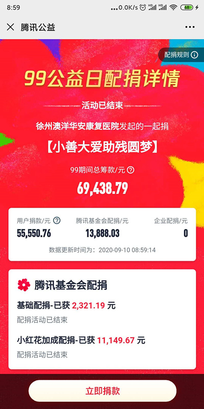 國泰投資所屬各單位積極響應(yīng)“99公益日”活動號召,認真研究配捐集小紅花獲取配捐活動規(guī)則,力求最大程度獲得騰訊公益平臺的配捐額度?;顒右园难笕A安醫(yī)院黨支部為發(fā)起單位、全體黨員干部職工為主力軍,組建了國泰投資先鋒隊等十余支愛心助捐團隊,分工明確、密切配合,集中在9月7、8、9日三天進行募捐、點贊集小紅花獲取配捐。截止9月9日,共籌集善款(含配捐)69438.79元(其中國泰投資募集善款22112元)。