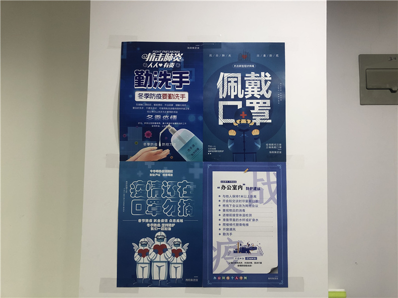一是營造防疫氛圍。在辦公區(qū)域內(nèi)懸掛“抗擊疫情 從我做起”防疫宣傳條幅,精選“防護建議”等防疫海報張貼在顯著位置,宣傳疫情防控知識,提高職工對疫情防控的重視,嚴(yán)防冬季疫情反彈。