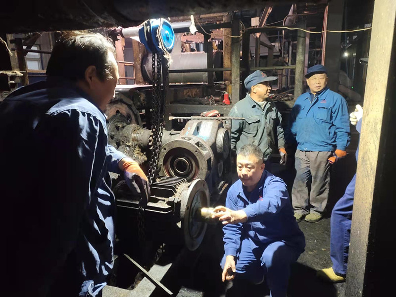 功夫不負(fù)有心人,經(jīng)過仔細(xì)測量,發(fā)現(xiàn)電機(jī)和減速機(jī)的聯(lián)軸器部分花鍵磨損,使得減速機(jī)和電機(jī)脫離,造成動力丟失。找到癥結(jié)后,大家雖如釋重負(fù),但一刻也沒有停歇,而是選擇繼續(xù)奮戰(zhàn),對聯(lián)軸器部位重新定位安裝,其他設(shè)備也全部安裝恢復(fù),確保尺寸正確后裝機(jī)運(yùn)轉(zhuǎn),試運(yùn)行顯示正常,掌聲不約而同地劃破寂靜的車間。