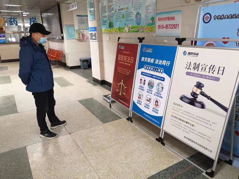 國泰投資公司在所屬公司、醫(yī)院、酒店等人流密集場所布置“法制宣傳”、“憲法宣傳”、“疫情防控宣傳”展板,發(fā)放《憲法普及知識》《傳染病防控法普及知識》折頁進(jìn)行宣傳。
