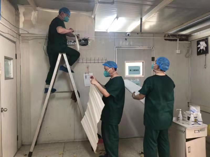院領(lǐng)導班子深入“污染區(qū)”一線,經(jīng)過現(xiàn)場勘查,克服疫情期間物資缺乏、沒有施工人員的困難,制定了用現(xiàn)成材料低成本施工的方案,工會主席高磊同志和信息科李峰科長一起帶領(lǐng)大家在污染區(qū)內(nèi)爭分奪秒現(xiàn)場進行整改落實。歷時兩天保質(zhì)保量完成了施工任務(wù),有力保障了醫(yī)院的平穩(wěn)安全運營。