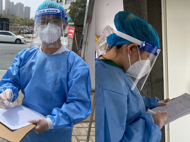 4月7日,是夫妻倆連續(xù)做社區(qū)抗疫志愿者的第7天,他們接到機(jī)場社區(qū)布置的最新任務(wù),下午2:00開始在九里峰景小區(qū)內(nèi)開展“掃樓”行動?!?個單元,98層,196戶,晚上6:00前必須完成任務(wù)!”思維敏捷的馮子晏迅速估算了時間,按照每戶1分鐘,只要三個多小時,完成任務(wù)不在話下。然而,在實(shí)際操作過程中,他才發(fā)現(xiàn)自己想簡單了。很多居民警惕性高,要盤問好久才開門;有些居民記不清核酸檢測次數(shù),需要打開手機(jī)小程序查看;還有的人家人口總數(shù)多,逐一問完記完要過很久;而且電梯等起來也太耗時。怎么辦?夫妻二人改變策略,首先乘坐電梯來到最高層,自上而下逐層步行走訪,然后由妻子小夏敲門詢問,增強(qiáng)親和力,丈夫小馮做好信息記錄。即使這樣,也不敢有絲毫耽擱,更別提再浪費(fèi)時間跑到遠(yuǎn)處找?guī)?。小夏雖然心疼,也只能安慰小馮“再忍忍”。一個下午的“馬不停蹄”,記完最后一個字,小馮立刻將登記表塞給小夏,飛快地向廁所跑去。而小夏彎了彎膝蓋,緩解下疲勞,隨手脫下手套,這才發(fā)現(xiàn)敲門的兩個手指關(guān)節(jié)已微微有些紅腫,按了按,疼地不自覺輕聲“啊”了一聲。