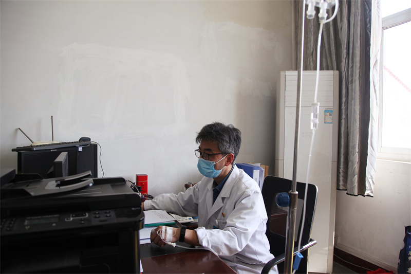 除了辛苦奮斗在采樣現(xiàn)場的人員,還有一位帶給大家感動的人,他就是防控辦副主任趙智勇。防控任務(wù)責(zé)任重大,事無巨細(xì)。自負(fù)責(zé)防控工作以來,他加班加點(diǎn),付出了大量心血,晚上參加上級防控會議是家常便飯,會議開到凌晨一兩點(diǎn)鐘并不少見。身邊的同事評價(jià)他“趙老師是全年無休!”工作的緊張及辛苦,使他得了高血壓,這次全員核酸檢測時(shí),他還在輸液治療中。為了不影響工作,他只能中午在辦公室一邊輸液,一邊聯(lián)絡(luò)協(xié)調(diào)采樣現(xiàn)場工作,并每小時(shí)一次對各采樣點(diǎn)報(bào)來的核酸采樣數(shù)據(jù)進(jìn)行匯總上報(bào)。