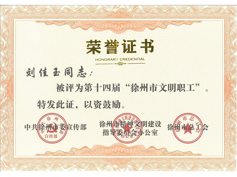 由徐州市委宣傳部、市文明辦、市總工會聯(lián)合開展的第十四屆“徐州市十佳文明職工”和“徐州市文明職工”評選活動揭曉,徐州市環(huán)保集團所屬公司職工劉佳玉被評為“徐州市文明職工”。