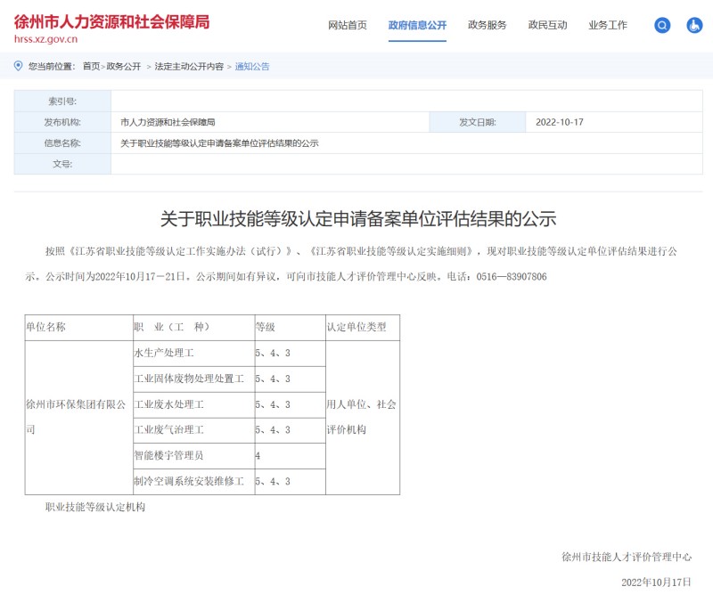 徐州市環(huán)保集團(tuán)評價中心通過徐州市人力資源和社會保障局審批。按照《江蘇省職業(yè)技能等級認(rèn)定工作實施辦法(試行)》《江蘇省職業(yè)技能等級認(rèn)定實施細(xì)則》,徐州市環(huán)保集團(tuán)有限公司成為水生產(chǎn)處理工、工業(yè)固體廢物處理處置工、工業(yè)廢水處理工、工業(yè)廢氣治理工、制冷空調(diào)系統(tǒng)安裝維修工的5、4、3級以及智能樓宇管理員4級的職業(yè)技能等級認(rèn)定機(jī)構(gòu)。
