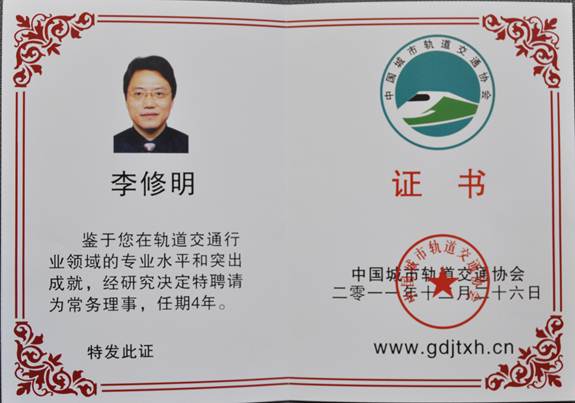 2011年12月26日,集團公司正式獲批成為中國城市軌道交通協(xié)會常務(wù)理事單位,2012年1月4日集團公司作為中國城市軌道交通協(xié)會常務(wù)理事單位正式掛牌開展工作。集團公司黨委書記、董事長李修明,黨委副書記、副董事長、總經(jīng)理李曉東被中國城市軌道交通協(xié)會特聘為常務(wù)理事。