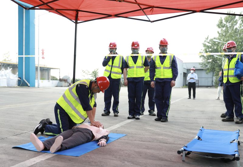 本次應(yīng)急演練活動現(xiàn)場位于危廢處置中心危險廢物焚燒車間,模擬場景設(shè)計為巡檢人員在更換窯頭噸桶廢液時,由于操作不當(dāng),回流管從收集桶中甩出至地面,廢液飛濺到巡檢人員額面部,造成灼傷。同時,廢液濺至回轉(zhuǎn)窯周邊遇熱燃燒,并點燃回流管不斷涌出的廢液。事故發(fā)生后,危廢中心應(yīng)急救援隊伍各司其職,消防與搶險救災(zāi)組使用滅火器、消火栓、消防水炮霧化滅火;警戒保衛(wèi)組對事故現(xiàn)場警戒;醫(yī)療救護(hù)組對受傷人員進(jìn)行心肺復(fù)蘇急救,將受傷員工外送就醫(yī);環(huán)境保護(hù)組打開應(yīng)急水池閘門,做好消防水及洗消水的收集工作。通過各現(xiàn)場應(yīng)急救援組織機(jī)構(gòu)協(xié)同努力,緊急情況得以解除,現(xiàn)場經(jīng)洗消檢驗后恢復(fù)正常狀態(tài)。