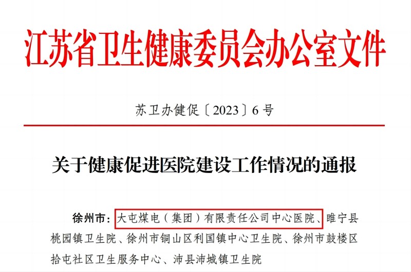 喜報(bào)!近日,在江蘇省衛(wèi)生健康委員會(huì)發(fā)布的《關(guān)于健康促進(jìn)醫(yī)院建設(shè)工作情況的通報(bào)》中,大屯煤電公司中心醫(yī)院順利通過(guò)江蘇省健康促進(jìn)醫(yī)院評(píng)審,被確定為江蘇省健康促進(jìn)醫(yī)院,并位居本次徐州市獲評(píng)省級(jí)健康促進(jìn)醫(yī)院榜首。