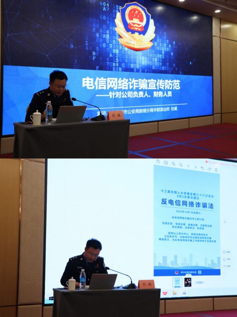 國泰投資公司以“無詐企業(yè)”創(chuàng)建活動為牽引,邀請徐州市公安局鼓樓分局豐財(cái)派出所杜所長擔(dān)任主講人,開展了一期“電信網(wǎng)絡(luò)詐騙防范宣傳”專題培訓(xùn)。杜所長以近期頻發(fā)的電信網(wǎng)絡(luò)詐騙真實(shí)案件為例,為員工深入剖析電信詐騙的基本類型、話術(shù)特點(diǎn)、基本流程以及防范措施,用“以案釋法”的方式講解了冒充客服詐騙、AI科技詐騙、刷單詐騙、公檢法詐騙等常見手段,從不同角度為員工講授防騙知識,同時也向員工普及了《網(wǎng)絡(luò)安全法》《反電信詐騙法》《個人信息保護(hù)法》等相關(guān)的法律法規(guī)知識。