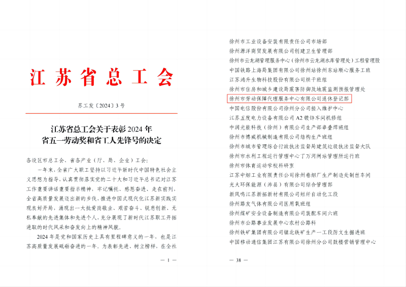 近日,江蘇省總工會(huì)下發(fā)《江蘇省總工會(huì)關(guān)于表彰2024年省五一勞動(dòng)獎(jiǎng)和省工人先鋒號(hào)的決定》(蘇工發(fā)〔2024〕3號(hào)),徐州國(guó)投集團(tuán)所屬徐州市勞動(dòng)保障代理服務(wù)中心有限公司退休登記部獲“江蘇省工人先鋒號(hào)”榮譽(yù)稱號(hào)。