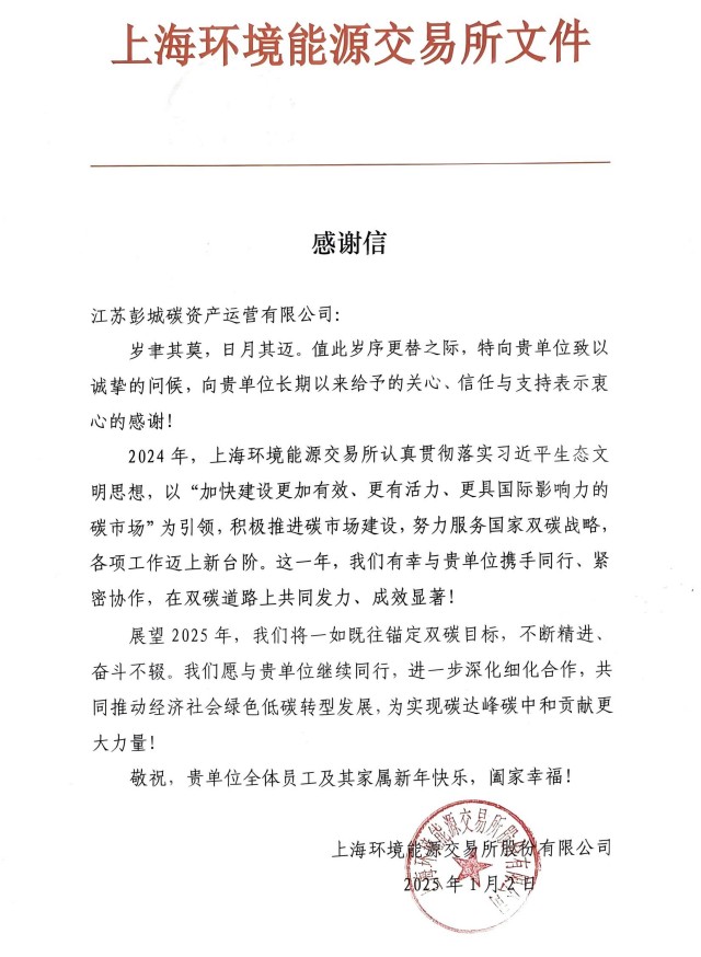 近日,彭城碳資產(chǎn)公司收獲了來(lái)自上海環(huán)境能源交易所(簡(jiǎn)稱(chēng)“上海環(huán)交所”)的一封感謝信。信中表示,對(duì)彭城碳資產(chǎn)公司積極推進(jìn)碳市場(chǎng)建設(shè)表示肯定,未來(lái)將繼續(xù)同行、細(xì)化合作。
