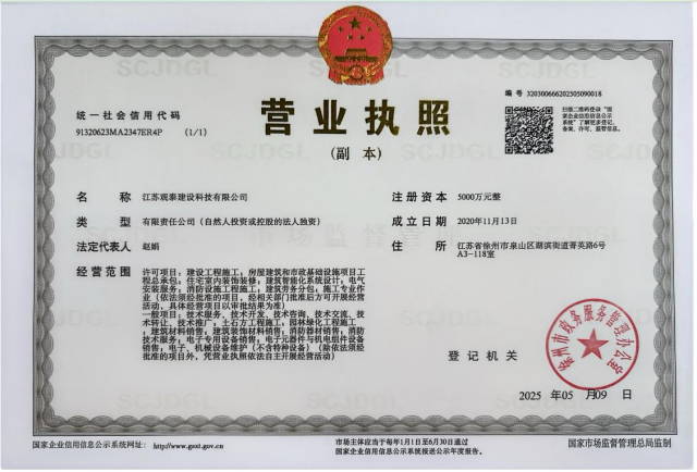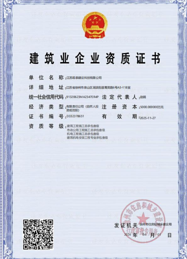 江蘇觀泰建設(shè)科技有限公司(以下簡稱“觀泰公司”)是作為徐州市屬國企重點(diǎn)培育的現(xiàn)代建設(shè)服務(wù)商,成立于2020年11月,注冊資本5000萬元,隸屬于徐州市國有資產(chǎn)投資經(jīng)營集團(tuán),是徐州市環(huán)投能源科技有限公司的全資子公司。公司立足“科技賦能、品質(zhì)筑基”發(fā)展理念,持有建筑工程、市政公用工程施工總承包三級、機(jī)電工程等多項(xiàng)專業(yè)資質(zhì),致力于為客戶創(chuàng)造顯著的經(jīng)濟(jì)和社會效益,并得到了客戶的高度認(rèn)可,現(xiàn)已形成覆蓋房建、市政、機(jī)電、智能化工程的全產(chǎn)業(yè)鏈服務(wù)能力。