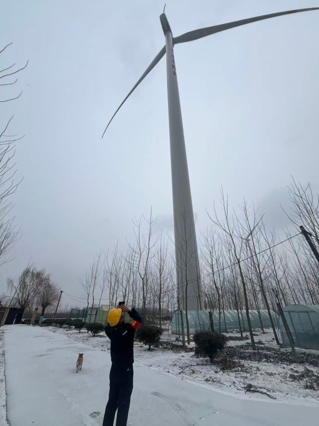 作業(yè)過程中,運維人員嚴(yán)格執(zhí)行“先關(guān)鍵設(shè)備、后輔助區(qū)域”原則,全員投入除雪保供一線。大家手持鐵鍬、掃帚等工具,全力清理升壓站主干道積雪積冰,搶通設(shè)備巡檢“生命線”,保障巡檢作業(yè)順利開展。充分運用無人機、望遠鏡、紅外測溫儀等設(shè)備,重點排查風(fēng)機葉片覆冰、集電線路有無異常等情況,同時組織人員逐戶上門發(fā)放《風(fēng)機覆冰安全告知書》,詳細(xì)告知風(fēng)機附近居民風(fēng)機覆冰可能引發(fā)的墜冰風(fēng)險,重點提醒居民在雨雪冰凍天氣減少戶外逗留、遠離風(fēng)機塔筒及葉片旋轉(zhuǎn)覆蓋區(qū)域,切實筑牢設(shè)備安全運行與居民人身安全“雙防線”。