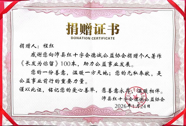 2026年1月24日下午,沛縣紅十字會德誠公益協(xié)會年會現(xiàn)場舉行了一場溫暖的圖書捐贈儀式。大屯煤電中心醫(yī)院職工,江蘇省作協(xié)、中國煤礦作協(xié)會員程紅女士向協(xié)會捐贈100冊個人著作。德誠公益協(xié)會為程紅頒發(fā)捐贈證書。