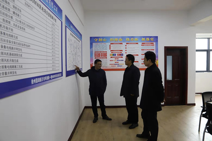 在新沂市阿湖鎮(zhèn),高翔實地調(diào)研了國湖公司一期90MW風(fēng)電項目升壓站建設(shè)情況,詳細了解了國湖公司風(fēng)電項目投資規(guī)模、投資收益、各項工作進度等情況,并在新沂市阿湖鎮(zhèn)便民中心開展座談交流。高翔指出,徐州國投集團作為市屬產(chǎn)業(yè)投資集團,企業(yè)發(fā)展勢頭較好、產(chǎn)業(yè)投資積極向上、員工拼搏干勁十足,在產(chǎn)業(yè)投資上取得了一定的成績。國湖公司投資的新沂市阿湖鎮(zhèn)一期90MW風(fēng)電項目作為可再生新能源行業(yè),投資規(guī)模較大,要重點做好如下四項工作:一要強化黨的建設(shè)。國湖公司作為徐州國投集團的三級企業(yè),要按照“國有企業(yè)經(jīng)營到哪里、黨組織就跟進到哪里”的原則,著重加強企業(yè)黨組織建設(shè),強化黨組織的政治引領(lǐng)、思想引領(lǐng)、組織引領(lǐng),要將國湖公司黨的建設(shè)與風(fēng)電項目施工相互融合、相互促進,要接好“全面從嚴治黨壓力傳導(dǎo)層層壓緊壓實”這個接力棒。二要強化作風(fēng)建設(shè)。國湖公司作為產(chǎn)業(yè)投資的執(zhí)行者,要更加堅決貫徹落實中央八項規(guī)定精神,進一步強化班子領(lǐng)導(dǎo)的帶頭表率作用,推動落實中央八項規(guī)定和實施細則精神常態(tài)化、長效化;要從小事抓起、從小處著眼,思想上繃緊弦、行動上管住腿,堅決做到不違規(guī)、不逾矩。三要強化流程意識。國湖公司要按照國有資產(chǎn)保值增值的要求,依規(guī)依法做好國有資產(chǎn)的管理工作;要嚴格按照“三重一大”實施辦法要求,強化黨的研究前置程序,進一步規(guī)范投資決策流程,確保做到信息透明、標(biāo)準(zhǔn)規(guī)范。四要壓實“兩個責(zé)任”。國湖公司要認真組織學(xué)習(xí)市委常委、市紀(jì)委書記、監(jiān)委主任董向陽的重要批示精神,要結(jié)合“不忘初心、牢記使命”主題教育檢視問題環(huán)節(jié)要求,重點圍繞“一違三亂兩高兩低”開展全面自查自糾和專項整改落實,進一步轉(zhuǎn)變思想觀念、提高政治站位,進一步健全組織、理順關(guān)系、配齊人員,推動黨的建設(shè)向縱深發(fā)展。