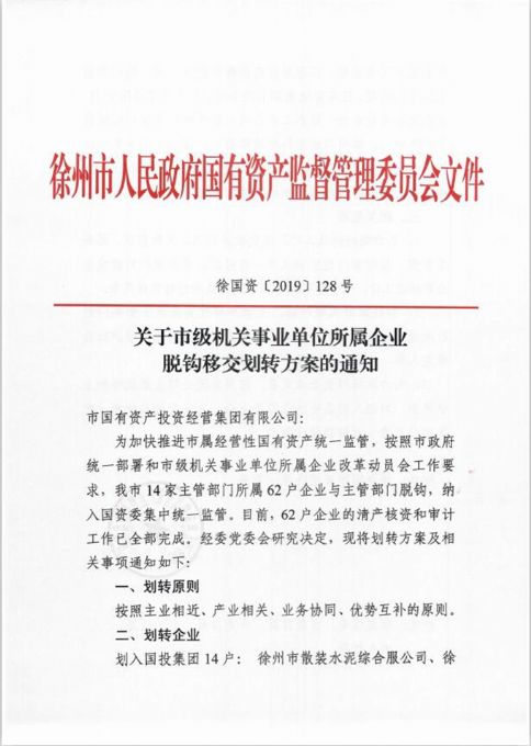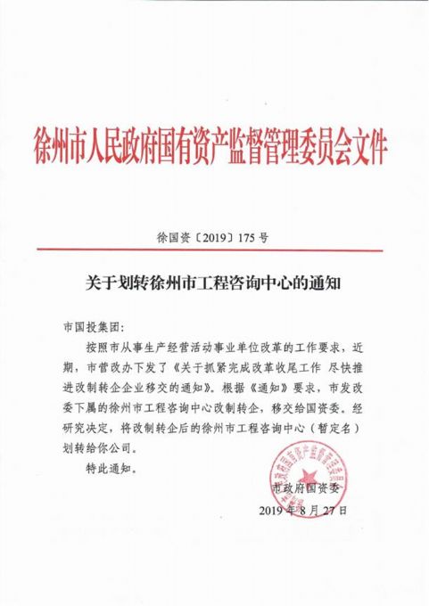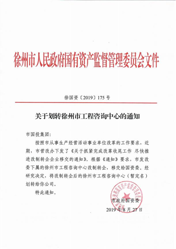 10.7月4日,市國資委印發(fā)《關(guān)于市級機(jī)關(guān)事業(yè)單位所屬企業(yè)脫鉤移交劃轉(zhuǎn)方案的通知》(徐國資〔2019〕128號),決定將徐州市商辦工業(yè)公司等14家企業(yè)劃入國投集團(tuán)。8月27日,市國資委印發(fā)《關(guān)于劃轉(zhuǎn)徐州市工程咨詢中心的通知》(徐國資〔2019〕175號),決定將改制轉(zhuǎn)企后的徐州市工程咨詢中心(暫定名)劃轉(zhuǎn)給國投集團(tuán)。